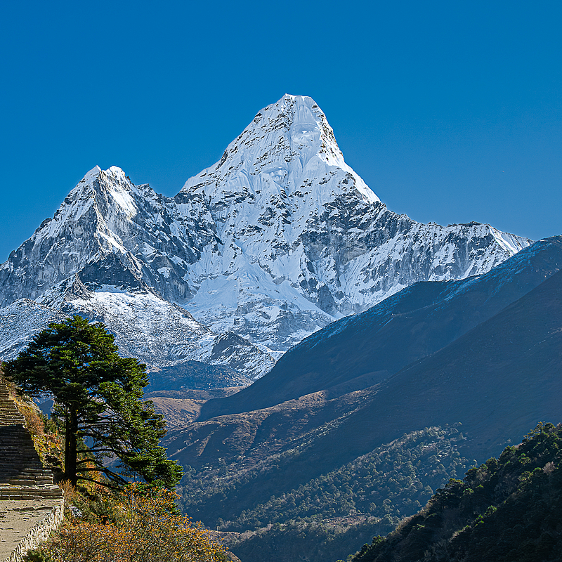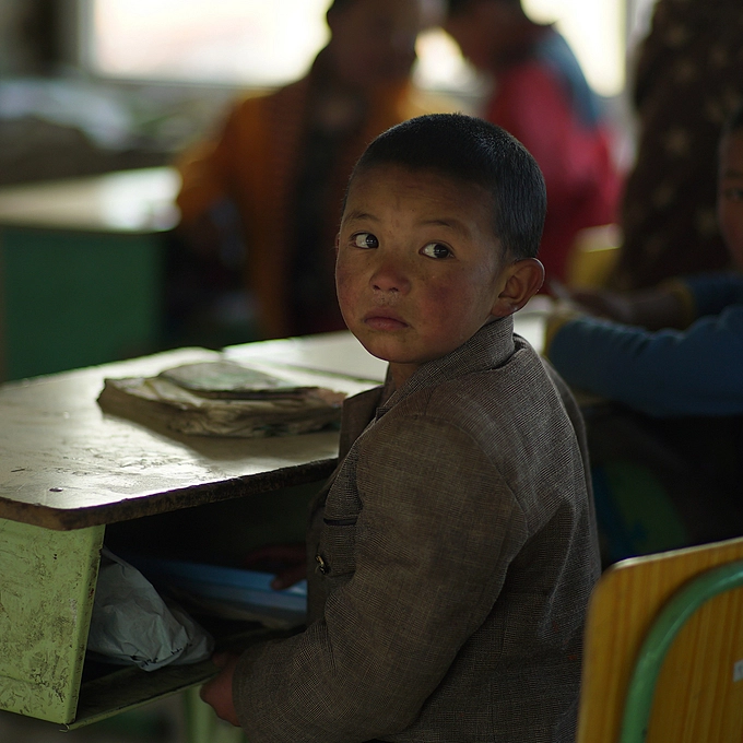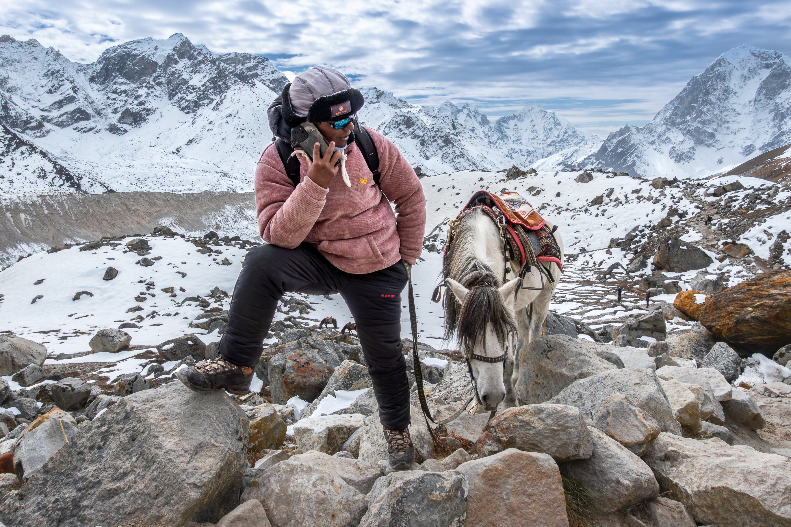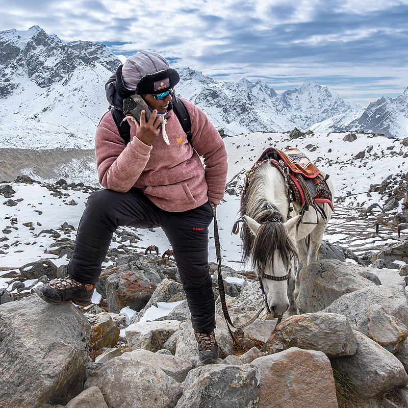 A young Sherpa hoping for a tourist who is tired of wandering around in the Nepalese Himalayas and wants a little ride (for a fee, of course), only US$ 100 😁.