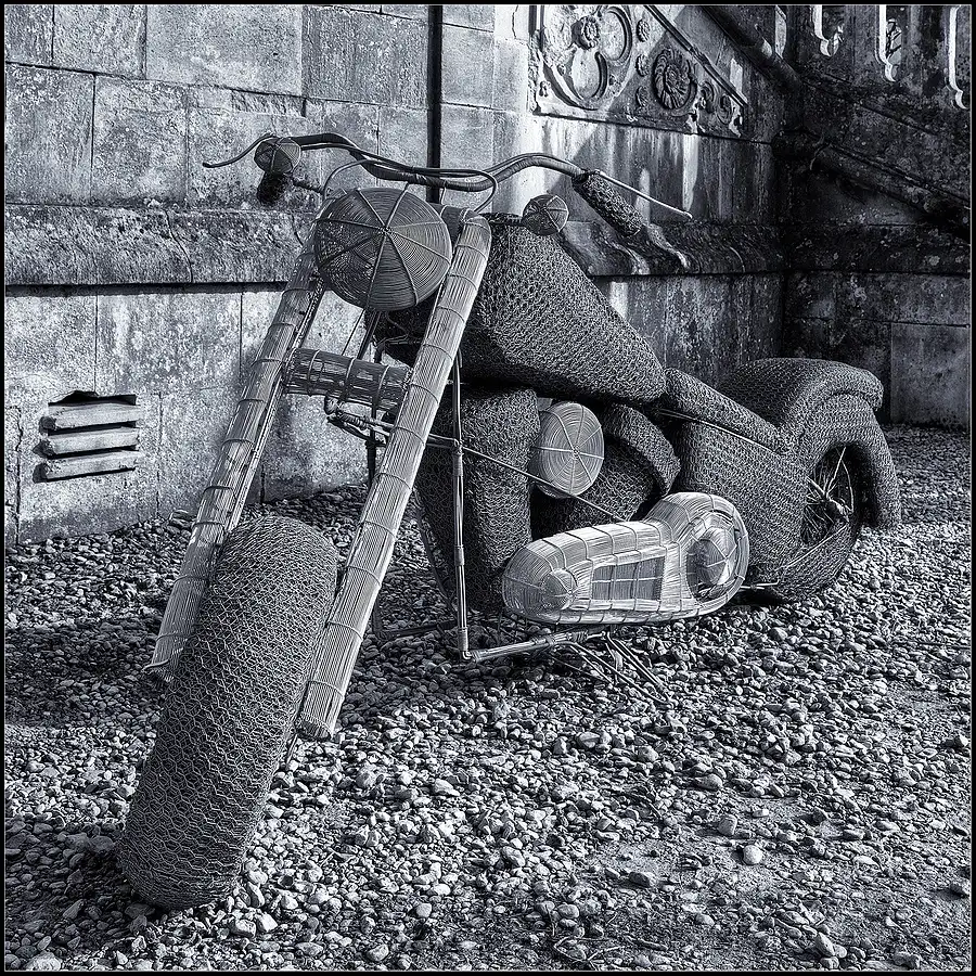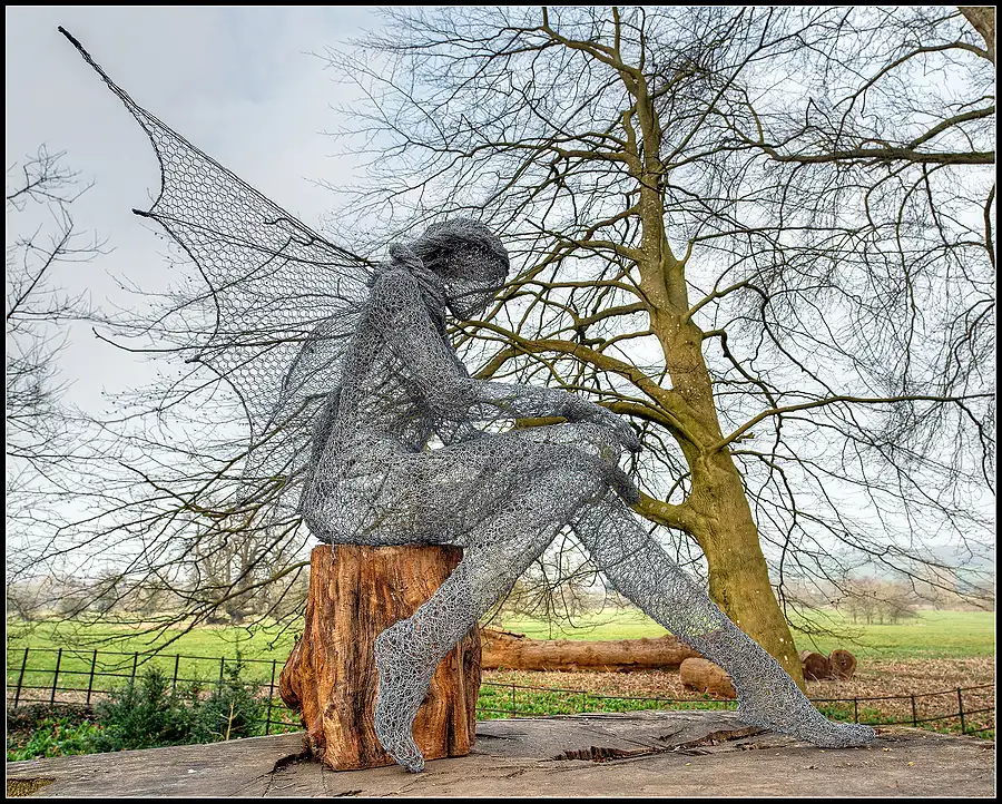 An exhibition by Derek Kinzett of wire sculpture in the grounds of Lacock Abbey, Wiltshire, England. Five frames Tone Mapped and converted with a Selenium Tone.