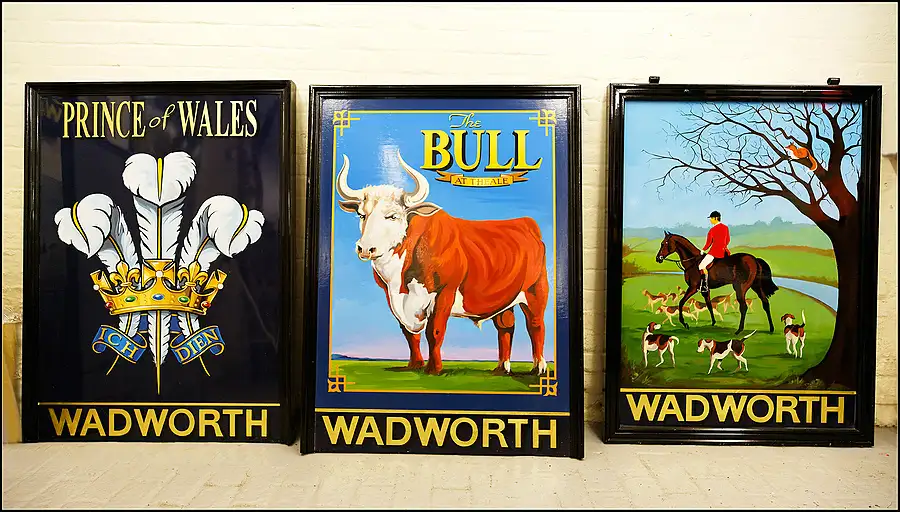 The eye catching signage that adorns virtually every one of Wadworth's 250-plus pub estate, is down to its own in-house sign writing team. The Wadworth's team are one of the country's last remaining in-house sign writing departments. Each sign painted on wood will last for ~10 years before repainting is necessary.