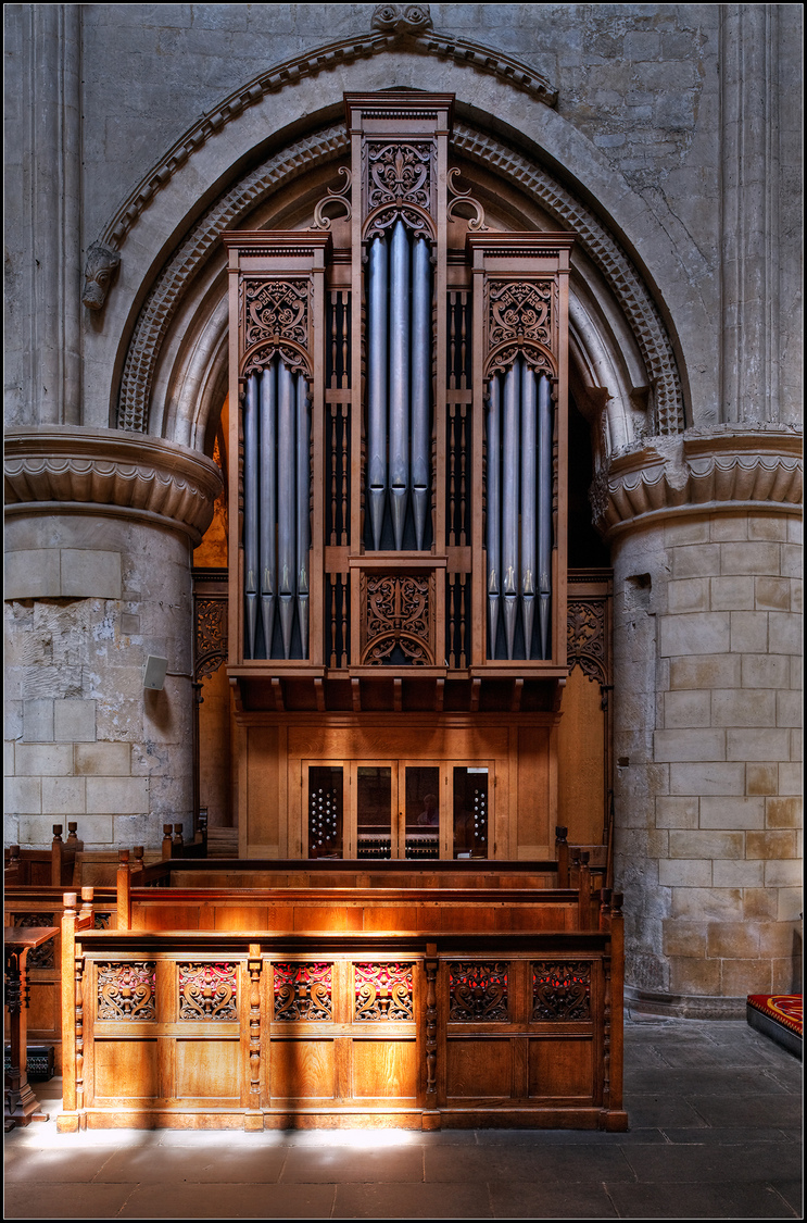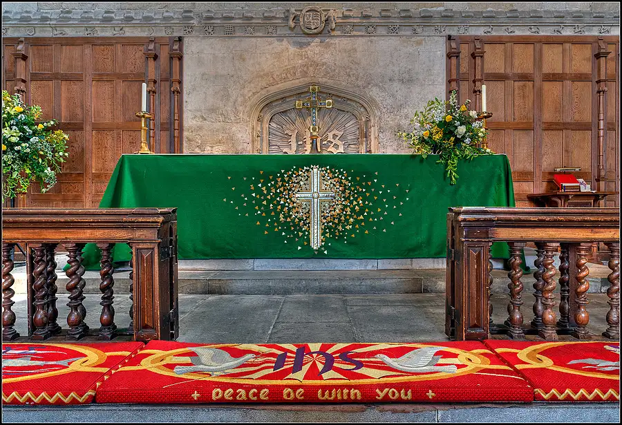 This is the altar inside Malmesbury Abbey, Wiltshire, England. Malmesbury Abbey, at Malmesbury in Wiltshire, England, is a religious house dedicated to Saint Peter and Saint Paul. It was one of the few English houses with a continual history from the 7th century through to the Dissolution of the Monasteries.