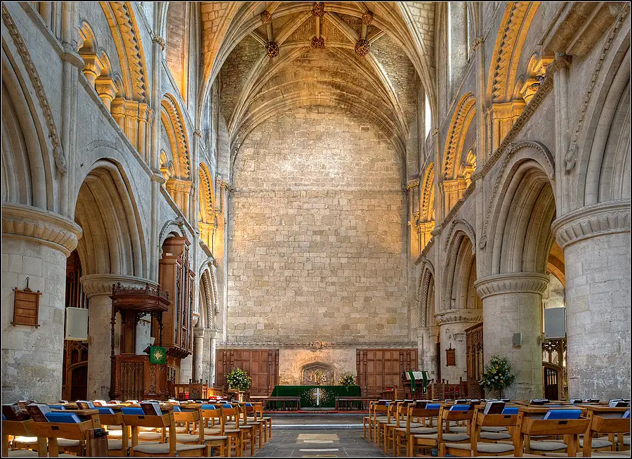 The present church, dating from the mid-12th century, is a fragment of the original abbey church, which had transepts, a tall central spire and a western tower. All that is left is the nave with isles. The nave was saved after the Reformation and became the parish church. The south porch contains some of the best Romanesque sculpture in England.