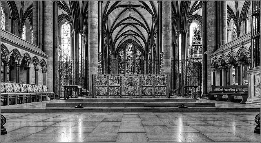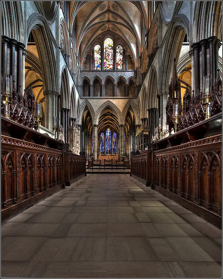 Taken from the altar rail inside Salisbury Cathedral, Wiltshire, England. Three RAW frames used for this image with B&W conversion using Nik's Silver Efex Pro software.