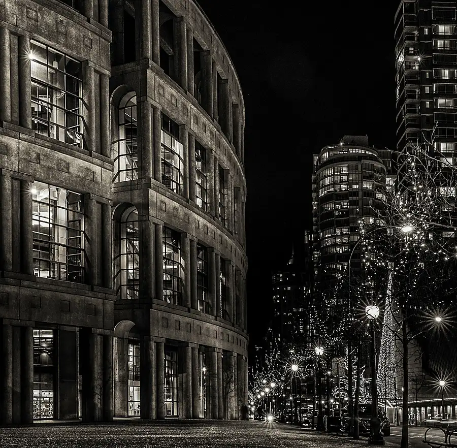 The Chevron sign sits close to Deadman's Island in Coal Harbour, Vancouver ~ its a challenge to photograph late at night. Exuding a steady glow of neon it seems to bleed into the surrounding darkness. Since I really wanted the background highrises to be almost just little squares of light, I solved the over exposure issue of the sign by dodging it during my exposure. <br />