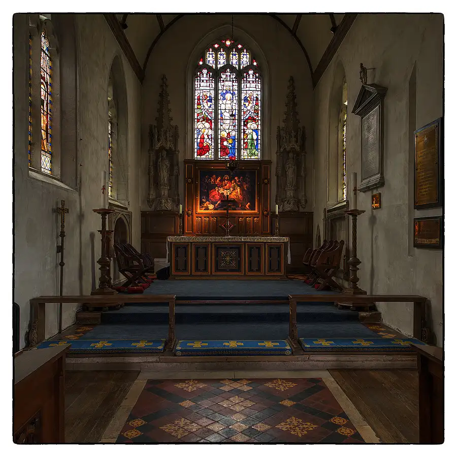 Looking towards the altar in my local parish church, St Mary's, Purton, Wiltshire, England. Shot at f/5.6 and ISO 400.