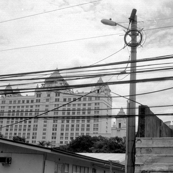 Photographing from moving vehicles is very difficult in the Philippines cities as there is a mass of WIRES everywhere ! The building in the distance is a posh Hotel ! I used my little 1950's - '60's Zeiss CONTINA