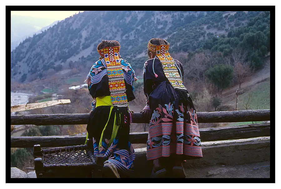 Two kalash Girls with their distinctive shell head dresses and plaits.