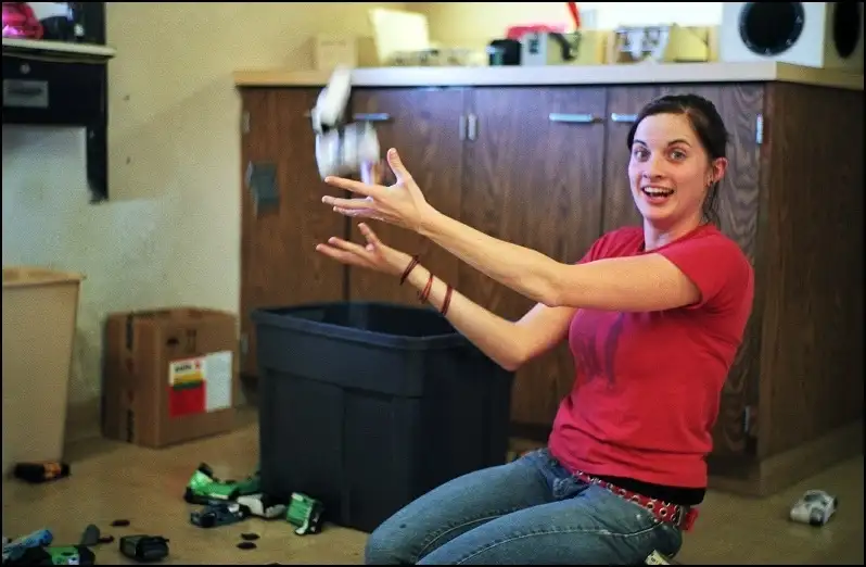 Jessica works at the local photo lab, and is sorting used single-use cameras for recycling.