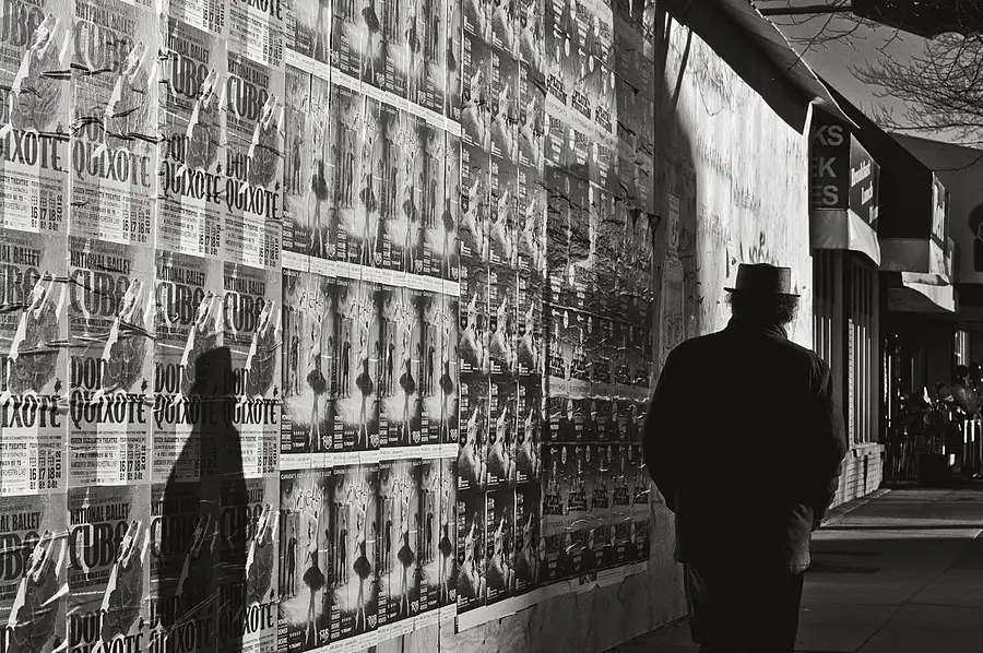 I took several photos of people and their shadows passing this vast display of posters - Liked the unusual shaped hat and curly hair on this man.