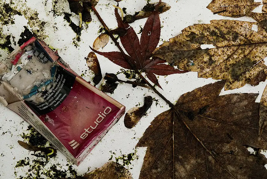 Why did I take this? There is a symbolic co-existence of nature and our urban society and the planned interaction we have created; the appearance of surface beauty and the rampant addiction to it - turning to age and decay; cause and effect. I wonder what that package holds now? A Pandora's Box. The tones and textures are fascinating. Its taken just as I saw it.