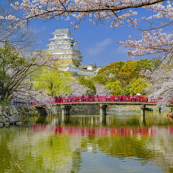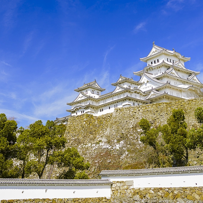Osaka Castle in a modern style. Unfortunately, the main building is not original but made of concrete, however, the moat and walls on which the castle stands are original.
