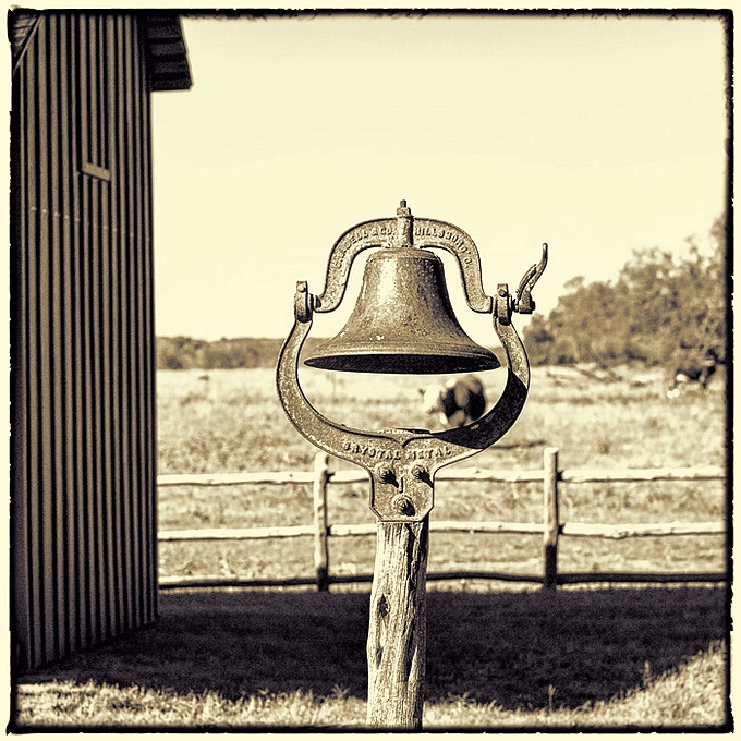 Taken at the LBJ Ranch and national park. The bell is behind President Johnson's birthplace. The cattle are Herefords descended from LBJ's herd. LBJ specified when he and Lady Bird gave a big part of the ranch to the National Park Service that the place be maintained as a working ranch.