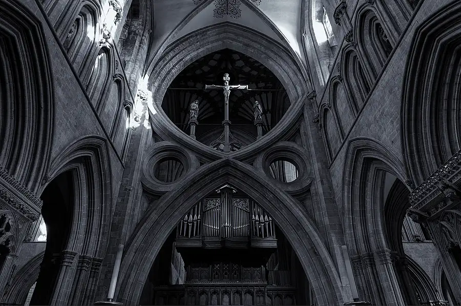Christ on the Cross above the spectacular Scissor Arches at the top end of the Nave in Wells Cathedral, Somerset, England. In the Nave the eye is drawn to the unique "scissor arches". The simple yet stunning design, often mistaken as modern, was a medieval solution (1338 - 1348) to sinking foundations.