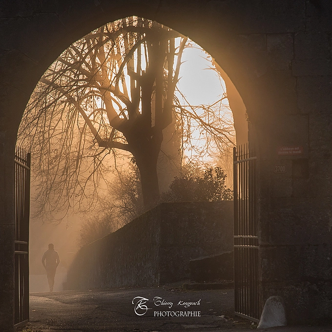 The royal abbey of Hautecombe entry, at dawn in the mist.