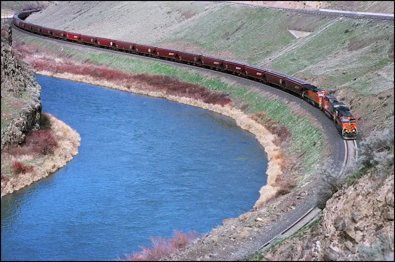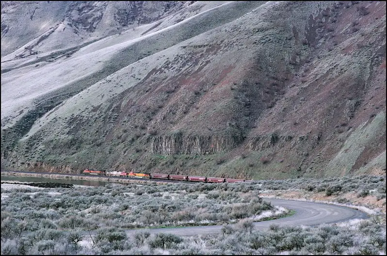 There is another photographer in the scene... up the slope about a car-length to the right of the third engine; dark clothing, light hat... getting a closer view of the train. I raced ahead of the train, skidded to a halt, jumped over the guard rail and waited less than a minute for the train to look "right".