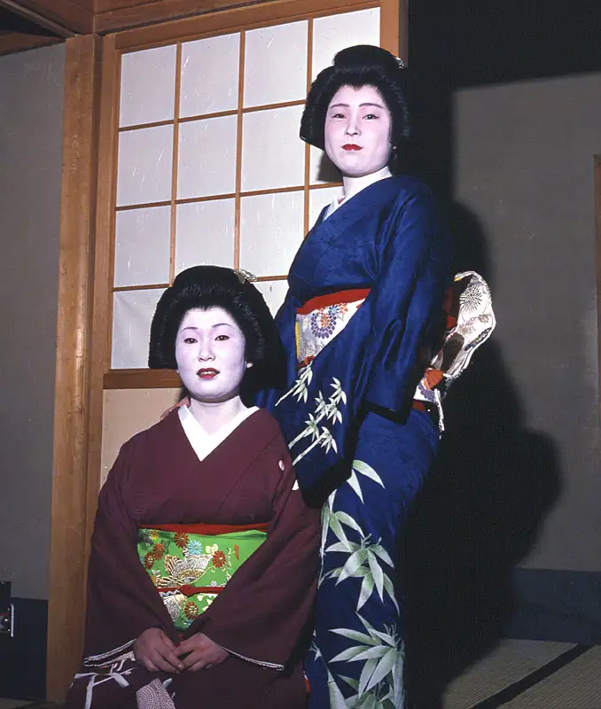 These are traditional 'Maiko' girls from the Kyoto area with the very white faces -- I went there in 1973 -- the photo was in the files of my agency for many years un-used -- now they are having a 'clear out' of all film photos. Braun flash, AGFA CT18 film