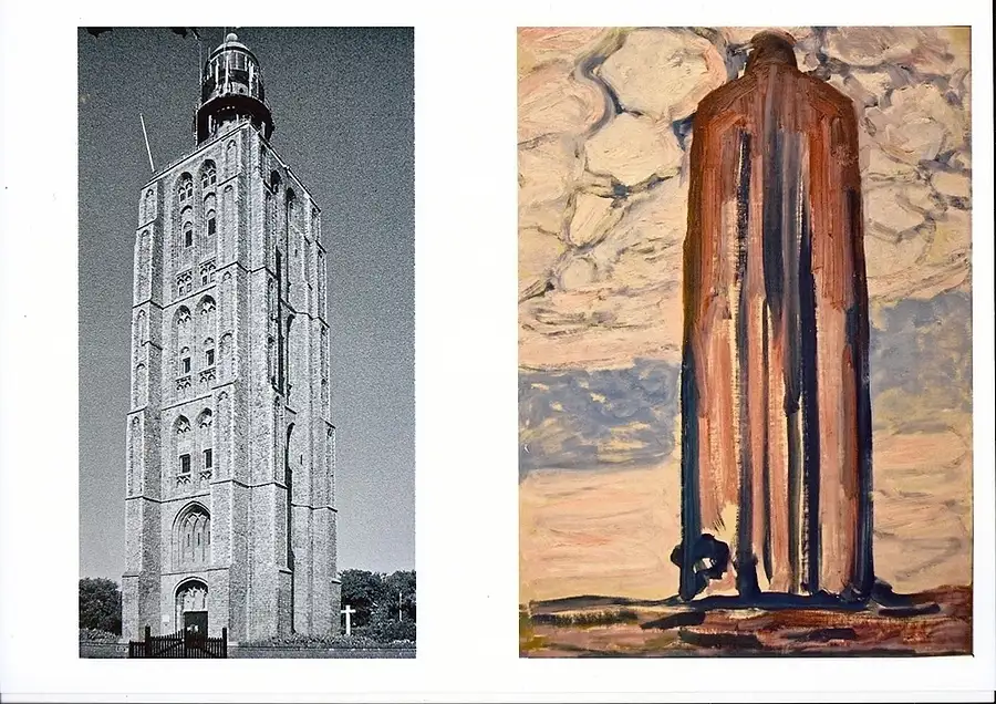 Photo of the lighthouse of Westkapelle en the painting by Piet Mondriaan (1908)