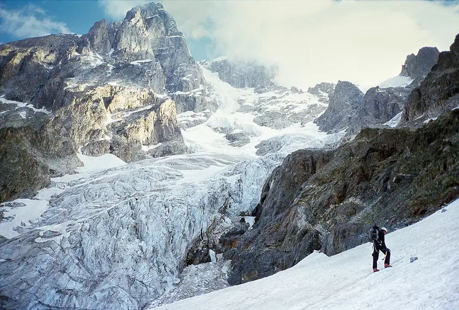 Ascending the SE couloir (55-60°, 1900m) of Chatyn-Tau (4310m), prior to making the first ski descent. <br />