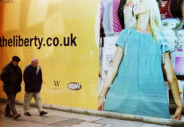 Taken at waist level as I passed -- focus and framing guessed , I wanted to use up some 1996 outdated Kodak P3200 film which I processed in home-made Microphen 1+1 for 9 mins @ 20oC . Grainy but OK for Computer viewing ! I cut her HEAD OFF but it is 'ARTY' and would sell for lots of $$$ or the newly-devalued £££ in a Gallery I bet !
