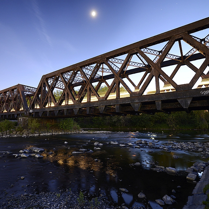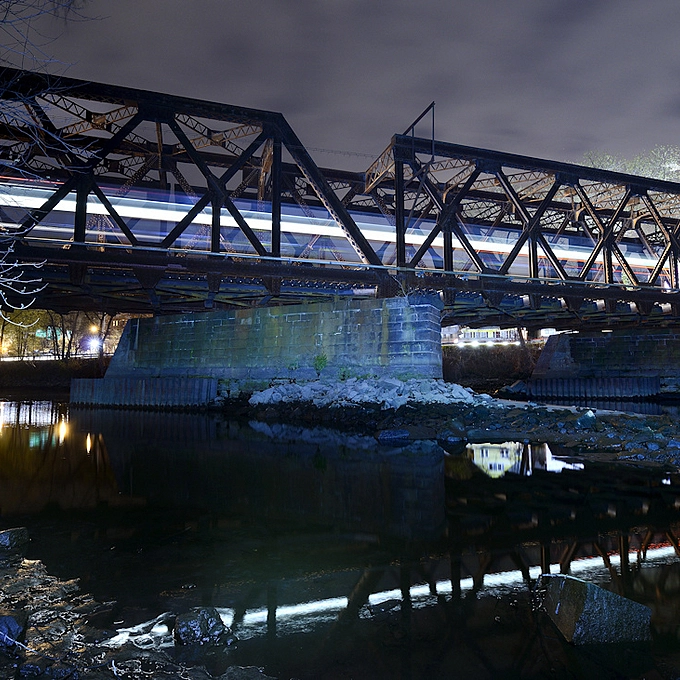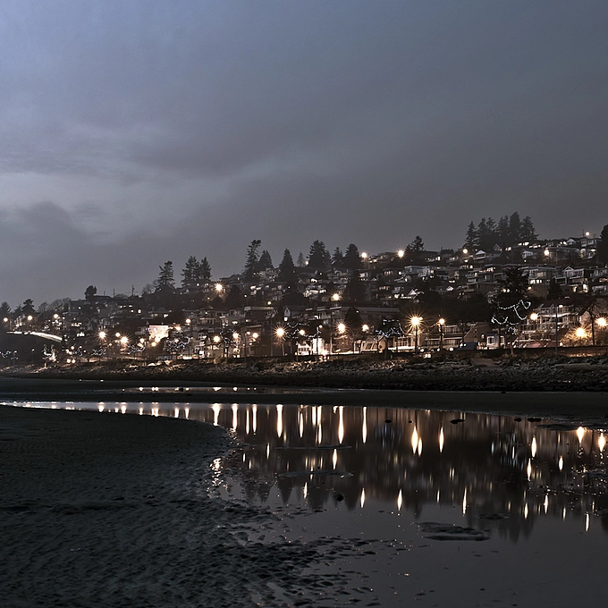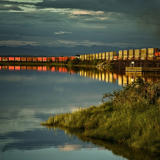 The BNSF travels across an old wooden trestle bridge and around Boundary Bay passing by Blackie Spit, an environmentally sensitive area... Crescent Beach, Surrey, BC