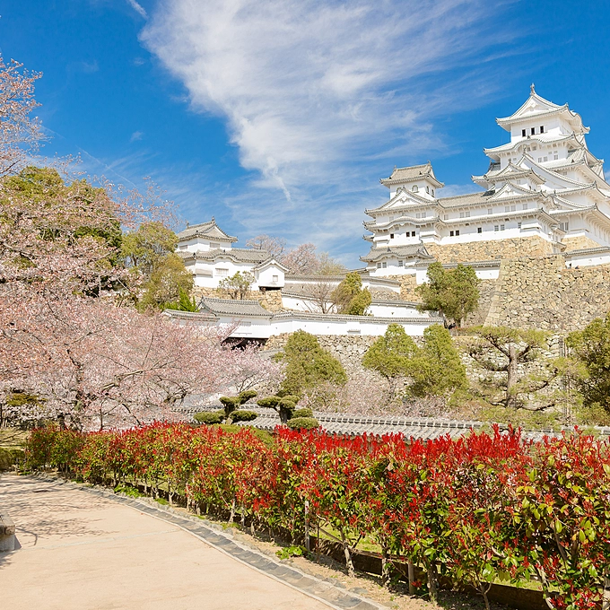 Osaka Castle in a modern style. Unfortunately, the main building is not original but made of concrete, however, the moat and walls on which the castle stands are original.