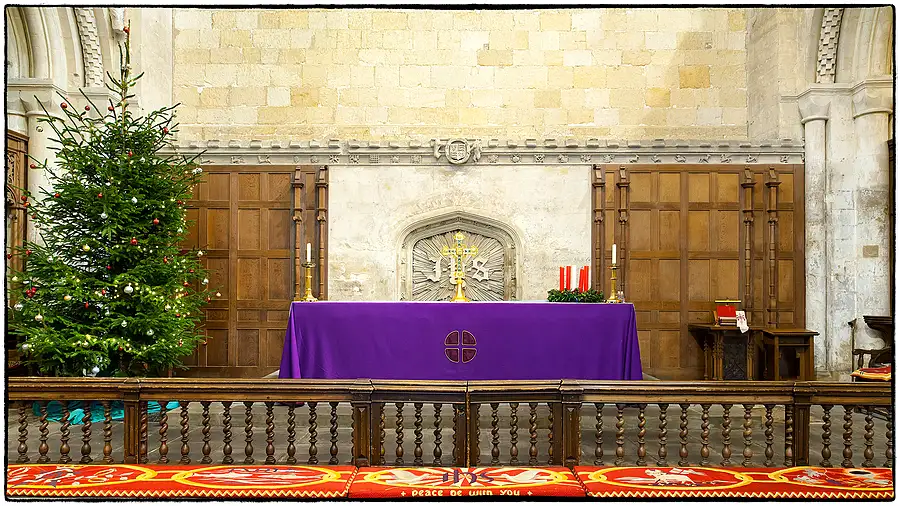 This is the altar inside Malmesbury Abbey, Wiltshire, England. Malmesbury Abbey, at Malmesbury in Wiltshire, England, is a religious house dedicated to Saint Peter and Saint Paul. It was one of the few English houses with a continual history from the 7th century through to the Dissolution of the Monasteries.