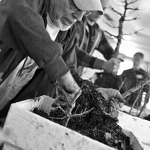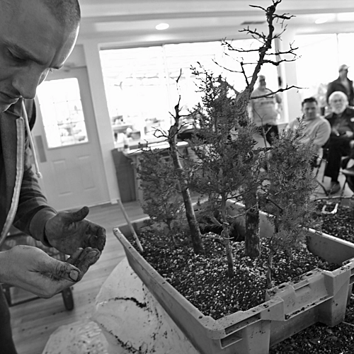 Bonsai Master Dave Schleser preparing a mixed species bonsai forest at the Bonsai Society of Dallas March meeting.