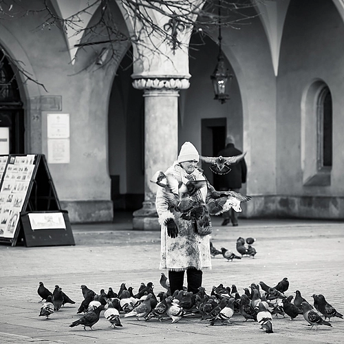 This old women feeds those birds every day in the same place (Krakow, Main Square). They are real Friends.