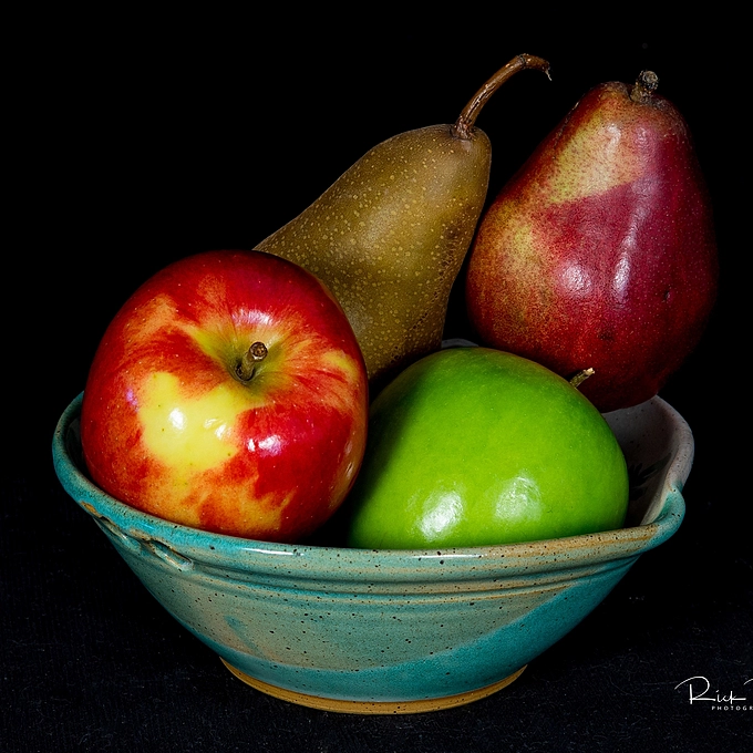 This is a three light setup. Two strip boxes from camera left and right through diffusers, one gridded light from behind to give glow to the red colored patch.