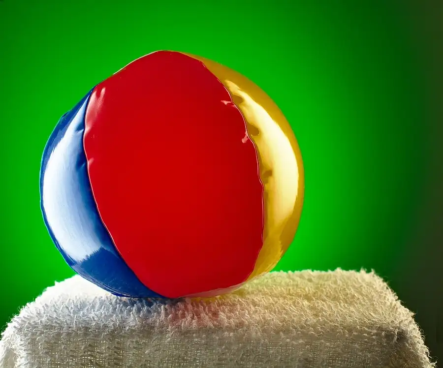 Miniature beach ball on towel.