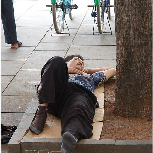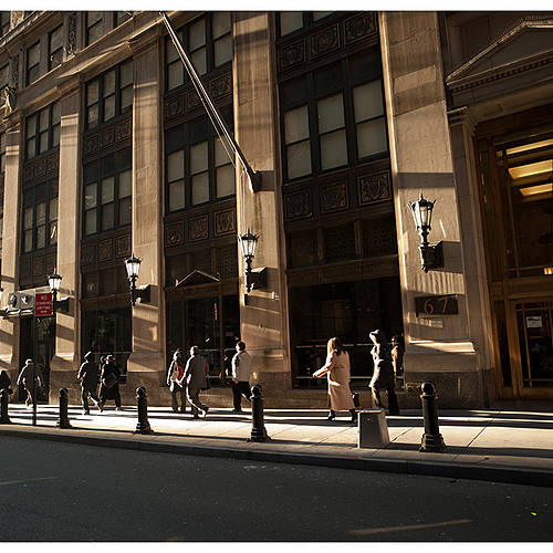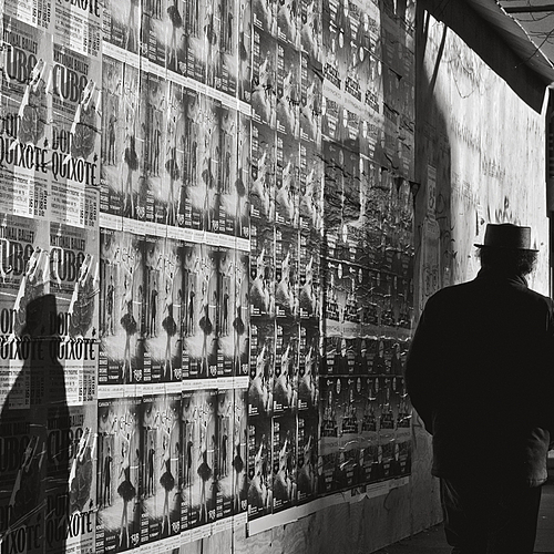 I took several photos of people and their shadows passing this vast display of posters - Liked the unusual shaped hat and curly hair on this man.