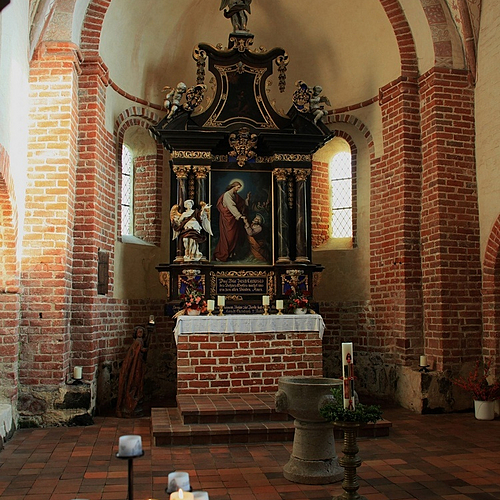 The romanic stone font is dated from around 1250! The first romanic part of the tree period brick stone church construction was built at 1168 by the first Danish settlers. The altar is from 1724.