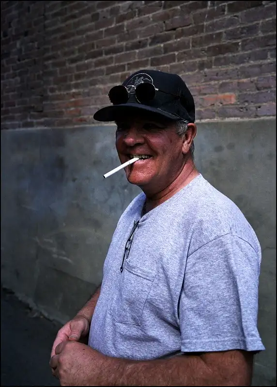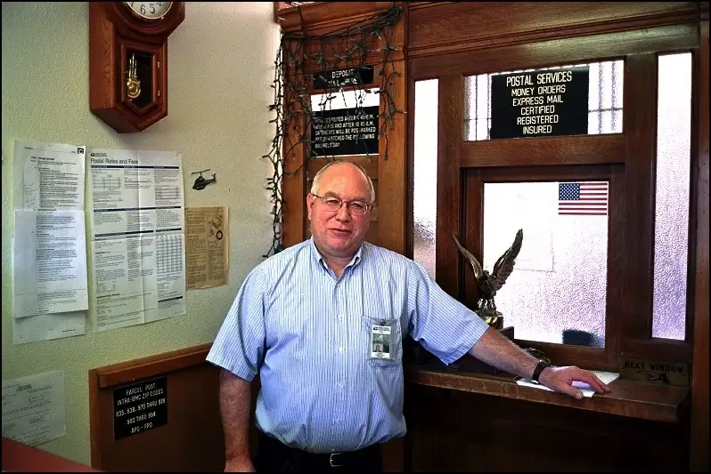 Postmaster of a very small town, in his new post office. He's pleased to have saved some of the old furnishings and wood from the original post office.