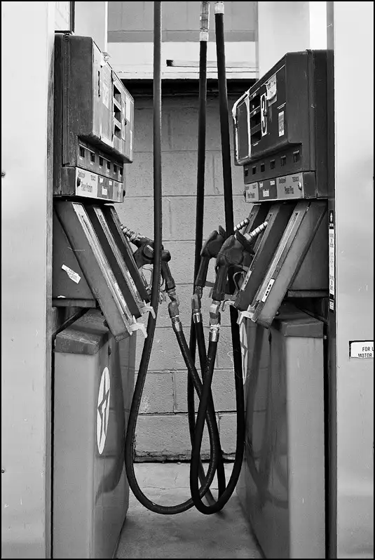 Opposing gas pumps at the side of the service station awaiting removal.