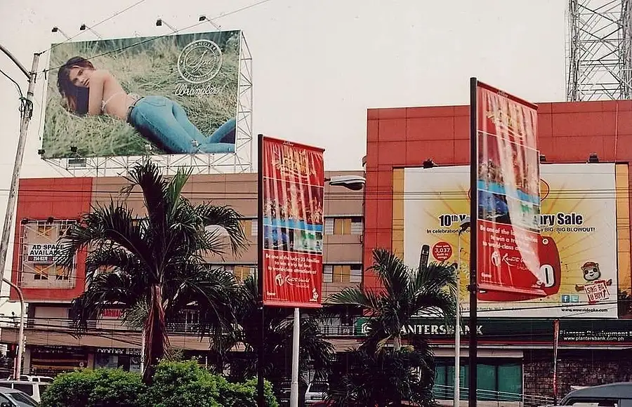 Taken from the window of a moving Toyota, Cebu City, Philippines -- they use images of Girls VERY LARGE but teh products they are advertising are very SMALL ! I used my 'Free Gift' 1996 PENTAX MZ-5