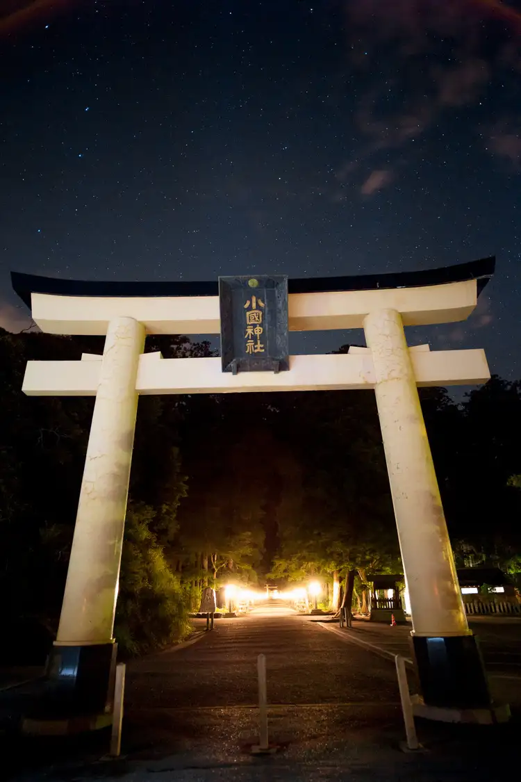 The front gate of Okuni Shrine, located in the rural town of Mori in Shizuoka, Japan. This photo was taken on a clear night with the lanterns appearing as a fiery path into the main shrine, balanced by a dim street lamp highlighting the gate.