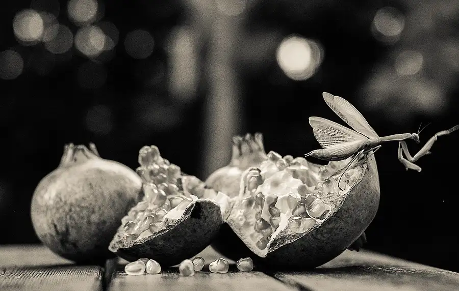 Mantis dancing on pomegranate