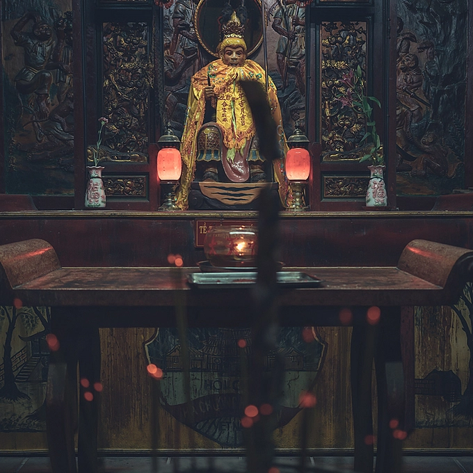Inside a Pagoda in the Cho Lon (China Town) area of Saigon (Ho Chi Minh City), Vietnam. This image sometimes appears not properly straightened, but in fact it is. Due to all of the tables in the pagoda not being aligned and sitting slightly off angle from each other, it gives the appearance that the image is not straight, and also makes you go slightly crazy when editing.