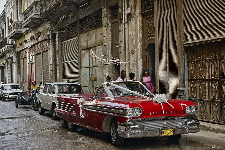Wandering down yet another side street, I spotted this car at the corner and ran to get an image. Since there were quite a crowd lingering around on the other side of the street, I asked someone who responded they are waiting for the bride to appear. Say no more! A bride and a red car! I waited in the gathering crowd of Cubans. Of note, the yellow licence plate designates taxi.