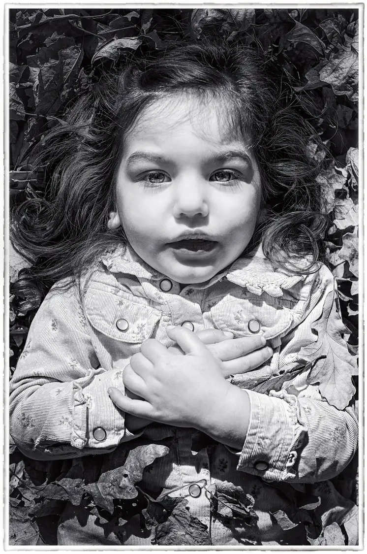 Portrait of little girl laying in fall leaves.