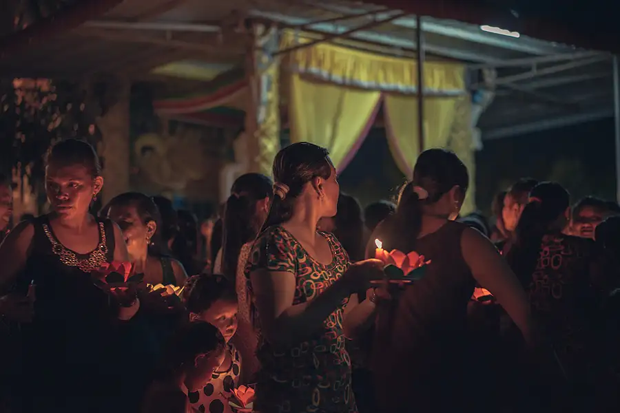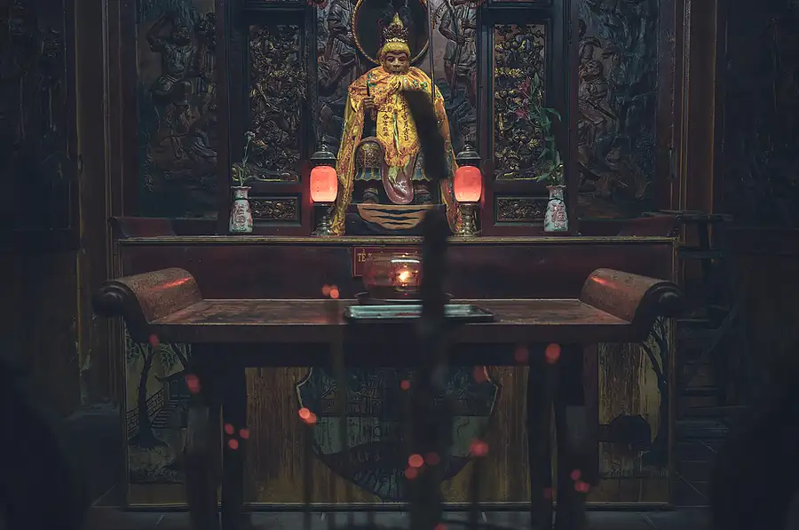 Inside a Pagoda in the Cho Lon (China Town) area of Saigon (Ho Chi Minh City), Vietnam. This image sometimes appears not properly straightened, but in fact it is. Due to all of the tables in the pagoda not being aligned and sitting slightly off angle from each other, it gives the appearance that the image is not straight, and also makes you go slightly crazy when editing.